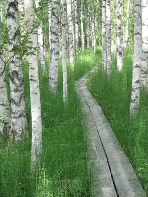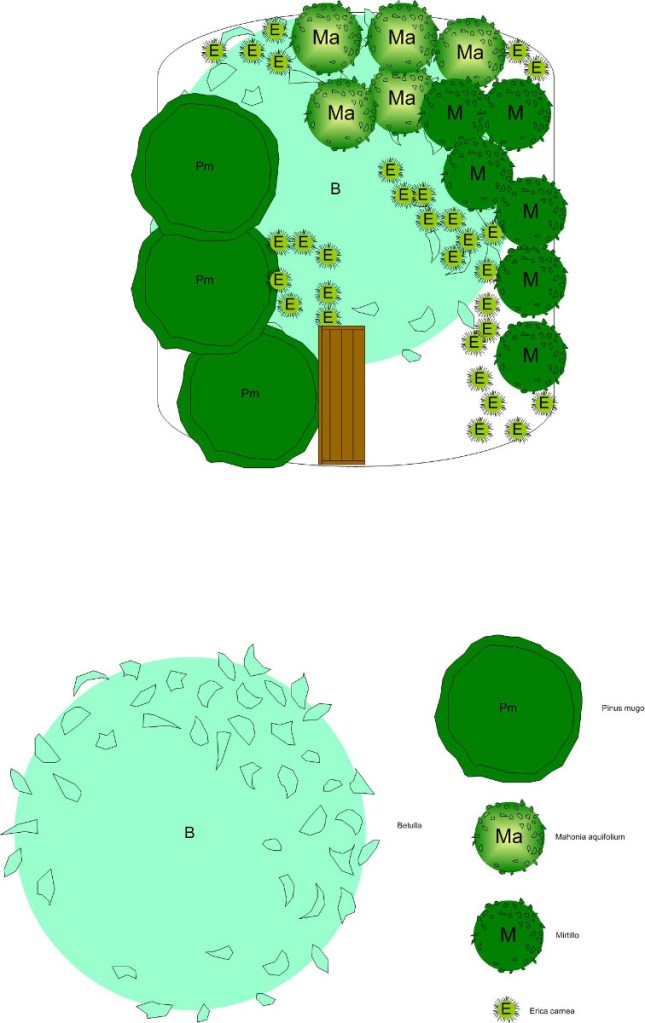 Voglio proporre qui un accostamento che mi ricorda un po’ la Finlandia: betulle, eriche, conifere nane, mahonie, mirtilli. Sono piante che richiedono un terreno un po’ acido; se il vostro non lo è potete intervenire con abbondanti pacciamature di aghi e corteccia di pino. Poco o niente compost.